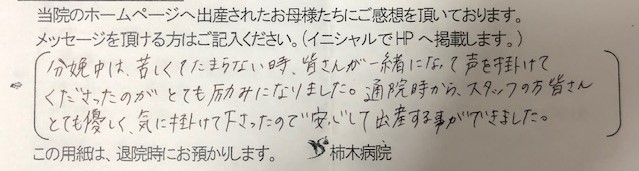 K.U様(2021年11月) 分娩中は、苦しくてたまらない時、皆さんが一緒になって声を掛けてくださったのがとても励みになりました。通院時から、スタッフの方皆さんとても優しく、気に掛けて下さったので、安心して出産する事ができました。