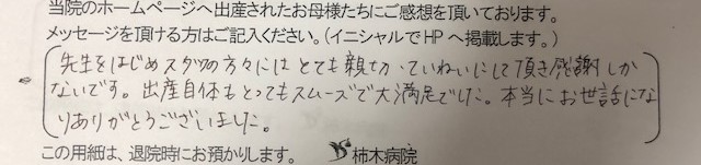 先生をはじめスタッフの方々にはとても親切、ていねいにして頂き感謝しかないです。出産自体みもとってもスムーズで大満足でした。本当にお世話になりありがとうございました。