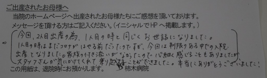 1人目の時はまだコロナがはやる前だったのですが、今回は制限のある中での入院・出産となりました。家族の付き添いがなかったので心細く感じることもありましたが、スタッフさんが気にかけてくれて、乗り越えることができました。本当にありがとうございました!