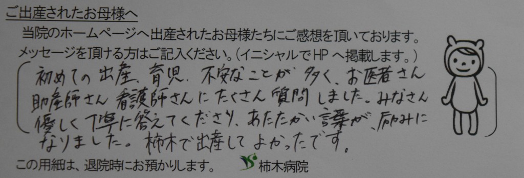 T.A様(2022年4月) 初めての出産、育児、不安なことが多く、お医者さん助産師さん看護師さんにたくさん質問しました。みなさん優しく丁寧に答えて下さり、あたたかい言葉が励みになりました。柿木で出産してよかったです。