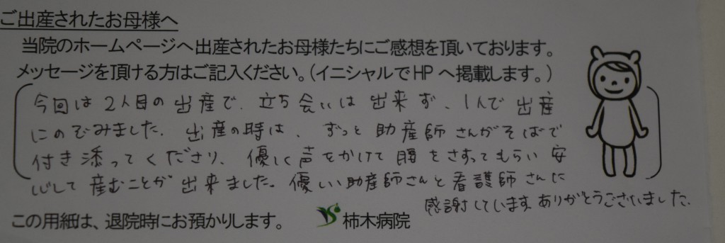 T.U様(2022年5月) 今回は2人目の出産で立ち会いは出来ず、1人で出産に臨みました。出産の時にずっと助産師さんがそばで付き添ってくださり、優しく声をかけて腰をさすってもらい、安心して産む事が出来ました。優しい助産師さんと看護師さんに感謝しています。ありがとうございました。