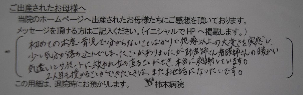初めての出産・育児で分からないことばかりで想像以上の大変さを実感し、少し気分が落ち込んでしまったことがありましたが助産師さん看護師さんの暖かい気遣いとサポートに救われ立ち直ることができ、本当に感謝しています。
