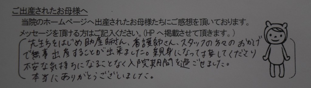 M.M様(2022年11月) 先生方をはじめ助産師さん、看護師さん、スタッフの方々のおかげで無事出産することが出来ました。親身になって接してくださり、不安な気持ちになることなく入院期間を過ごせました。 本当にありがとうございました。
