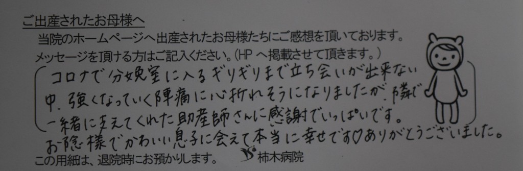 H.M様(2023年1月) コロナで分娩室に入るギリギリまで立ち会いが出来ない中、強くなっていく陣痛に心折れそうになりましたが、隣で一緒に支えてくれた助産師さんに感謝でいっぱいです。 おかげ様でかわいい息子に会えて本当に幸せです♡ ありがとうございました。