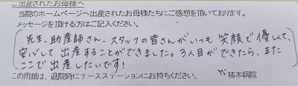 先生、助産師さん、スタッフの皆さんがいつも笑顔で優しくて、安心して出産することができました。3人目ができたら、またここで出産したいです!