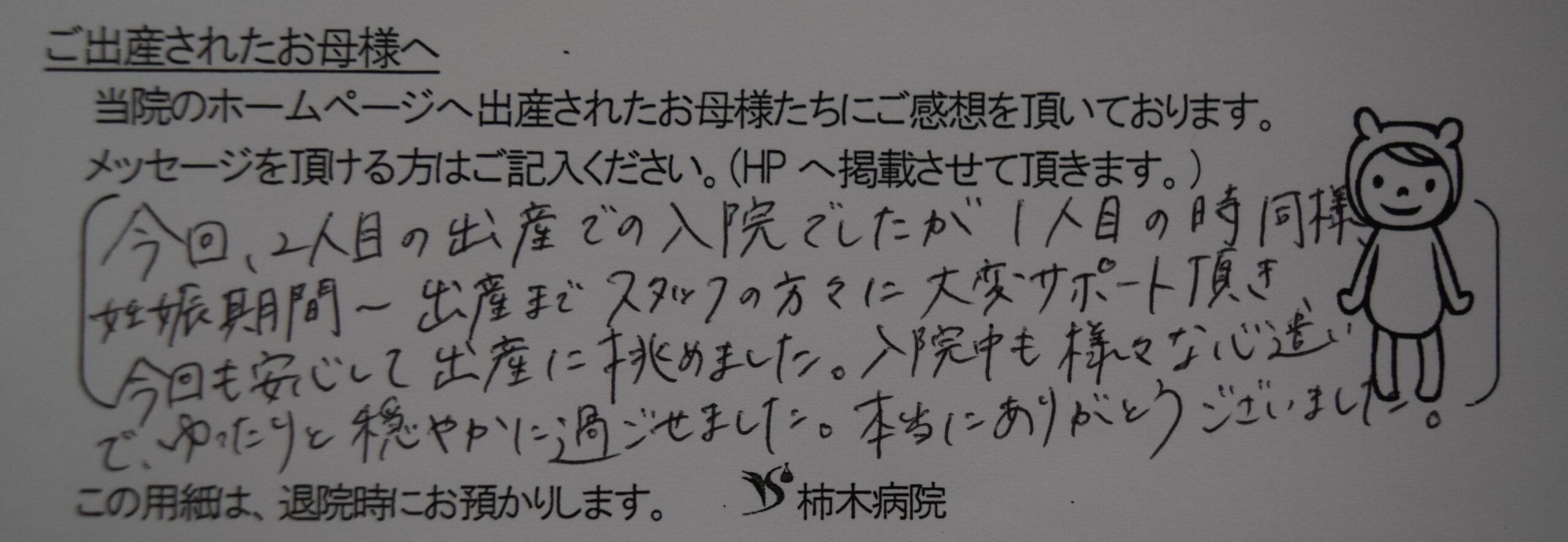S.I様(2023年5月) 今回、2人目の出産での入院でしたが、1人目の時同様、妊娠期間~出産までスタッフの方々に大変サポート頂き、今回も安心して出産に挑めました。入院中も様々な心遣いでゆったりと穏やかに過ごせました。本当にありがとうございました。