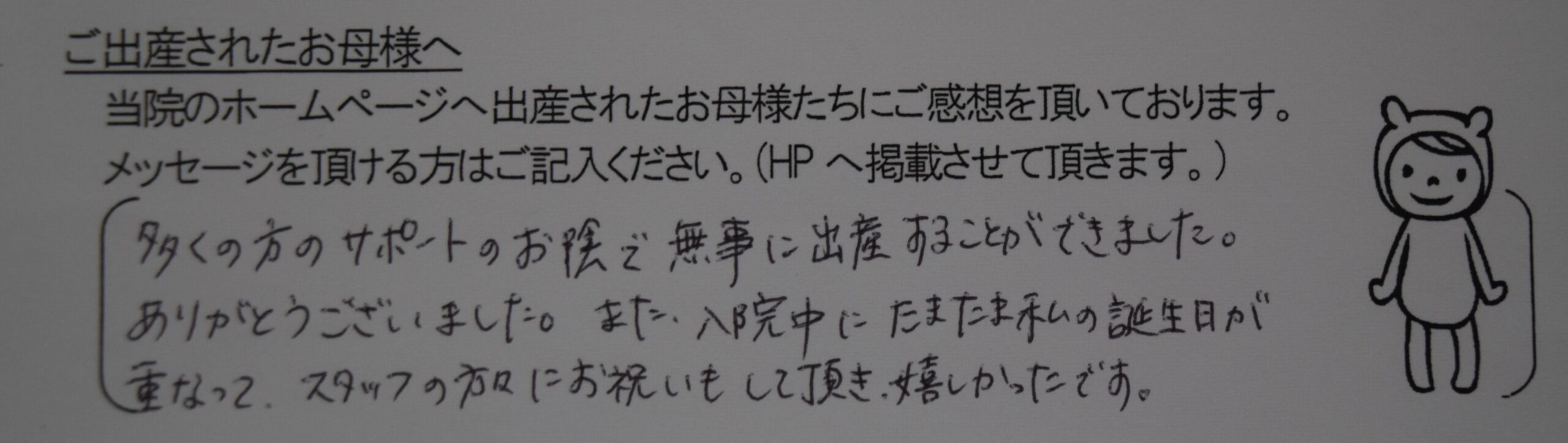 Y.T様(2023年5月) 多くの方のサポートのお蔭で無事に出産することができました。ありがとうございました。また、入院中にたまたま私の誕生日が重なって、スタッフの方々にお祝いもして頂き、嬉しかったです。