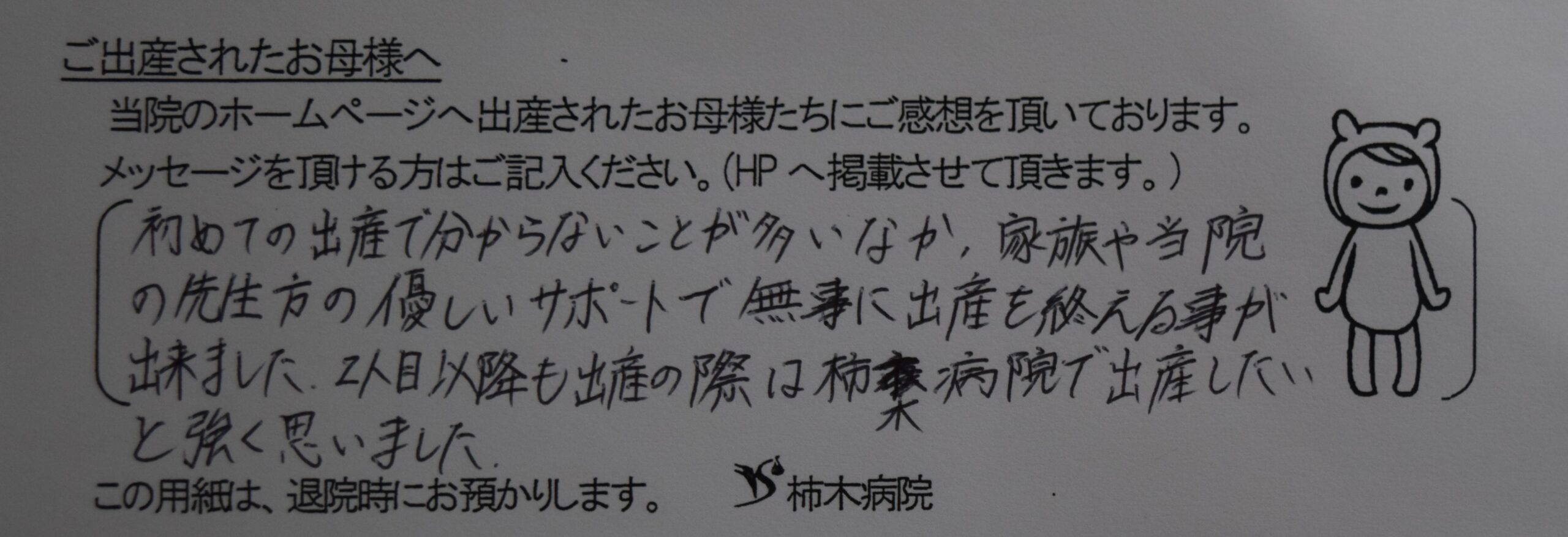 初めての出産で分からないことが多いなか、家族や当院の先生方の優しいサポートで無事に出産を終える事が出来ました。2人目以降も出産の際は柿木病院で出産したいと強く思いました。