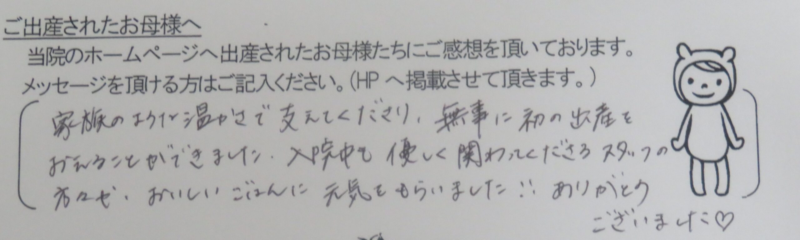 T.M様(2023年8月) 家族のような温かさで支えてくださり、無事に初の出産をおえることができました。入院中も優しく関わってくださるスタッフの方々やおいしいご飯に元気をもらいました!!ありがとうございました♡