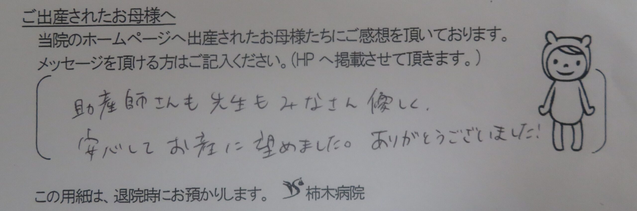 助産師さんも先生もみなさん優しく、安心してお産に臨めました。ありがとうございました!