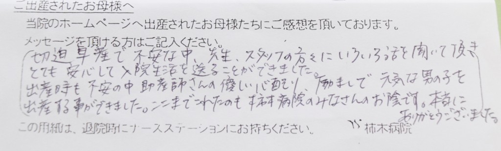 I.K様 切迫早産で不安な中、先生、スタッフの方々にいろいろ話を聞いて頂きとても安心して入院生活を送ることができました。出産時も不安の中、助産師さんの優しい心配り、励ましで元気な男の子を出産することができました。ここまでこれたのも柿木病院のみなさまのお陰です。本当にありがとうございました。