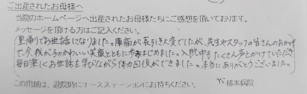 里帰りでお世話になりました。陣痛が長引き大変でしたが、先生やスタッフの皆さんのおかげで、今、我が子のかわいい笑顔とともに歩みはじめました。入院中もたくさん声をかけていただき毎日楽しくお世話を学びながら体力回復ができました。本当にありがとうございました。