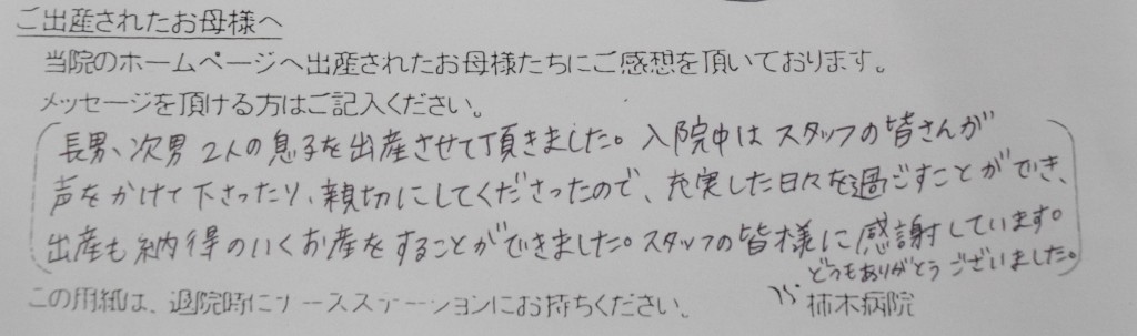 H.M様 長男、次男2人の息子を出産させて頂きました。入院中はスタッフの皆さんが声をかけて下さったり、親切にしてくださったので、充実した日々を過ごすことができ、出産も納得のいくお産をすることができました。スタッフの皆様に感謝しています。どうもありがとうございました。