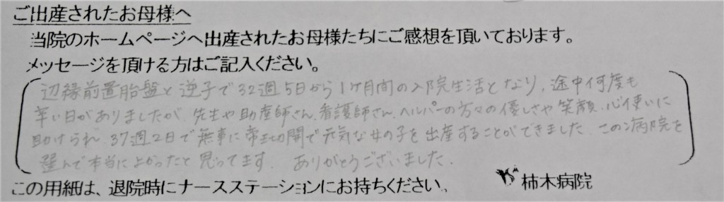 W.M様 辺縁前置胎盤と逆子で32週5日から1ヶ月間の入院生活となり、途中何度も辛い日がありましたが、先生や助産師さん、看護師さん、ヘルパーの方々の優しさや笑顔、心遣いに助けられ37週2日で無事に帝王切開で元気な女の子を出産することができました。この病院を選んで本当によかったと思ってます。ありがとうございました。