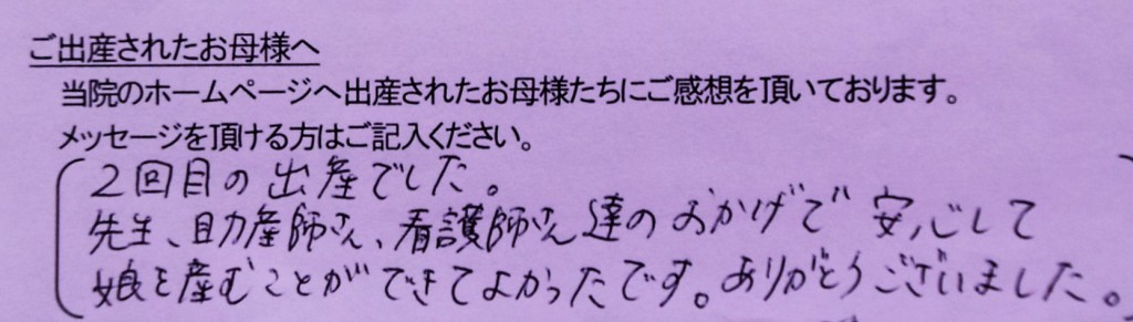 先生、助産師さん、看護師さん達のおかげで安心して娘を産むことができてよかったです。ありがとうございました。