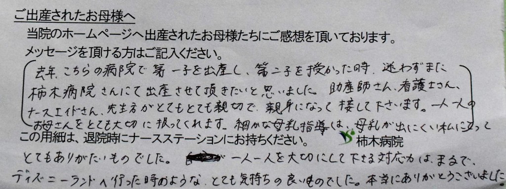 Y・H様 去年こちらの病院で第一子を出産して、第二子を授かった時、迷わずまた柿木病院さんにて出産させて頂きたいと思いました。助産師さん、看護師さん、ナースエイドさん、先生方がとても親切で親身になって接して下さいます。一人一人のお母さんをとても大切に扱ってくれます。細かな母乳指導は、母乳が出にくい私にとってとてもありがたいものでした。一人一人を大切にして下さる対応はまるでディズニーランドへ行った時のようなとても気持ちの良いものでした。本当にありがとうございました。