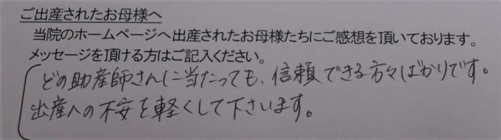 どの助産師さんに当たっても、信頼できる方々ばかりです。出産への不安を軽くして下さいます。
